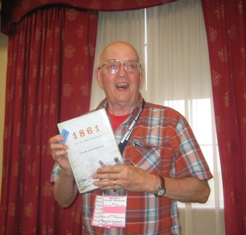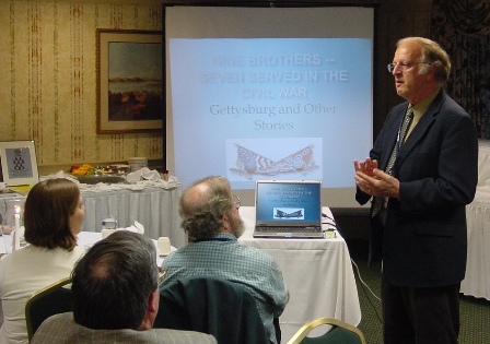 After dinner, Tom Haskell gave a very informative talk, with PowerPoint slides, entitled, Nine Brothers —Seven Served in the Civil War: Gettysburg and Other Stories. A pdf file containing all 39 of these slides is available by clicking here. The following seven brothers served in the Civil War: 1) Langdon Cheves Haskell served with General Maxcy Gregg and General A.P. Hill, 2) Charles Thomson Haskell was a Captain in the First Carolina Regulars, 3) William Thomson Haskell was a Captain of Infantry who served under A.P. Hill, 4) Alexander Cheves Haskell rose to the rank of Colonel of the Cavalry, 5) John Cheves Haskell was a Colonel of the Artillery Corps, 6) Joseph Cheves Haskell was a Captain & Asst. Adj. General in the Artillery, 7) Lewis Wardlaw Haskell was a private in the Cavalry. These seven brothers were the sons of Charles Thomson Haskell and his wife, Sophia Lovell Cheves Haskell. Their other children were the three daughters Mary Elizabeth – also known as Marie Elise Courtonne, Charlotte Thomson Haskell born after Charles Thomson – but lived only a few days, and Sophia Lovell Haskell who married Langdon Cheves. The two brothers who did not serve were Paul Thomson Haskell (too young to serve) and Hayne Cheves Haskell, who only lived two weeks and was buried by his sister, Charlotte (who also died young) in the cemetery at Rocky River Church in SC. Of the seven brothers who fought in the Civil War, four fought at Gettysburg: Langdon Cheves, William Thomson, John Cheves, and Joseph Cheves. Remarkably, they made up four of the six Haskells from the South who fought on the Confederate side at Gettysburg. Capt. William Thomson Haskell was killed on 2 July 1863 at Gettysburg. Tom showed photos of his battle sword.