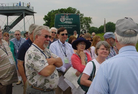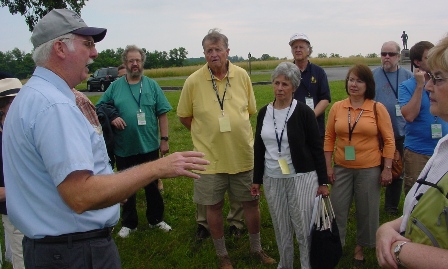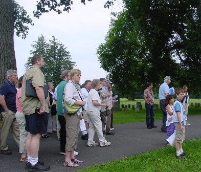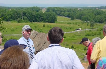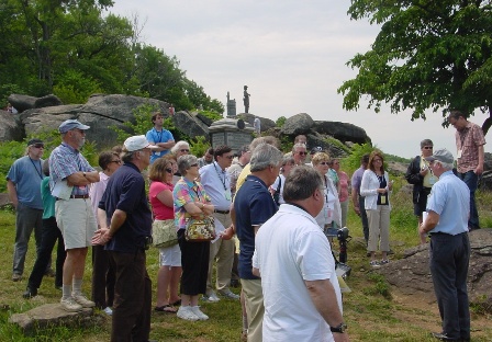 We climbed aboard the bus at 8:45 am on Saturday for a delightful and informative three-hour tour of the Soldiers’ National Cemetery and battlefield. Our tour guide, Ed Guy, handed out a large sheet to everyone entitled HASKELL REUNION—Gettysburg 2011. He had drawn a large map of the battlefield in the center of the sheet and then on each side he had listed all of the Haskells who fought at Gettysburg together with their state regiment and company. You can see a photo of this sheet by clicking here.